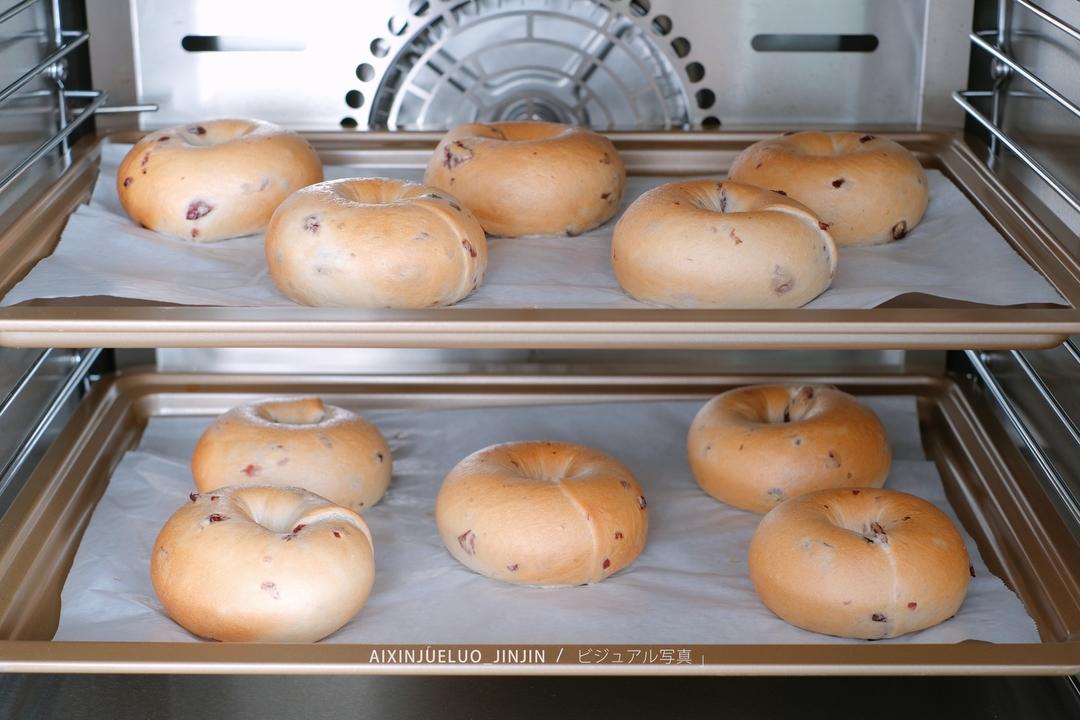 将煮好的贝果捞出来,摆放在烤盘上,放入烤箱烤制。 风炉:185度烤13分钟。 家用小烤箱:200度烤15分钟。 (温度和时间作为参考)