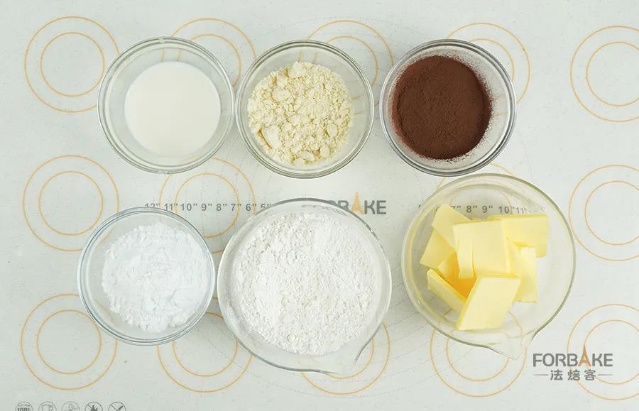 加入可可粉、杏仁粉、低粉混合。(如果需要做其他口味,可以用5g茉莉茶粉和适量柠檬皮碎/5-6g抹茶粉/适量红丝绒精来替换可可粉。)