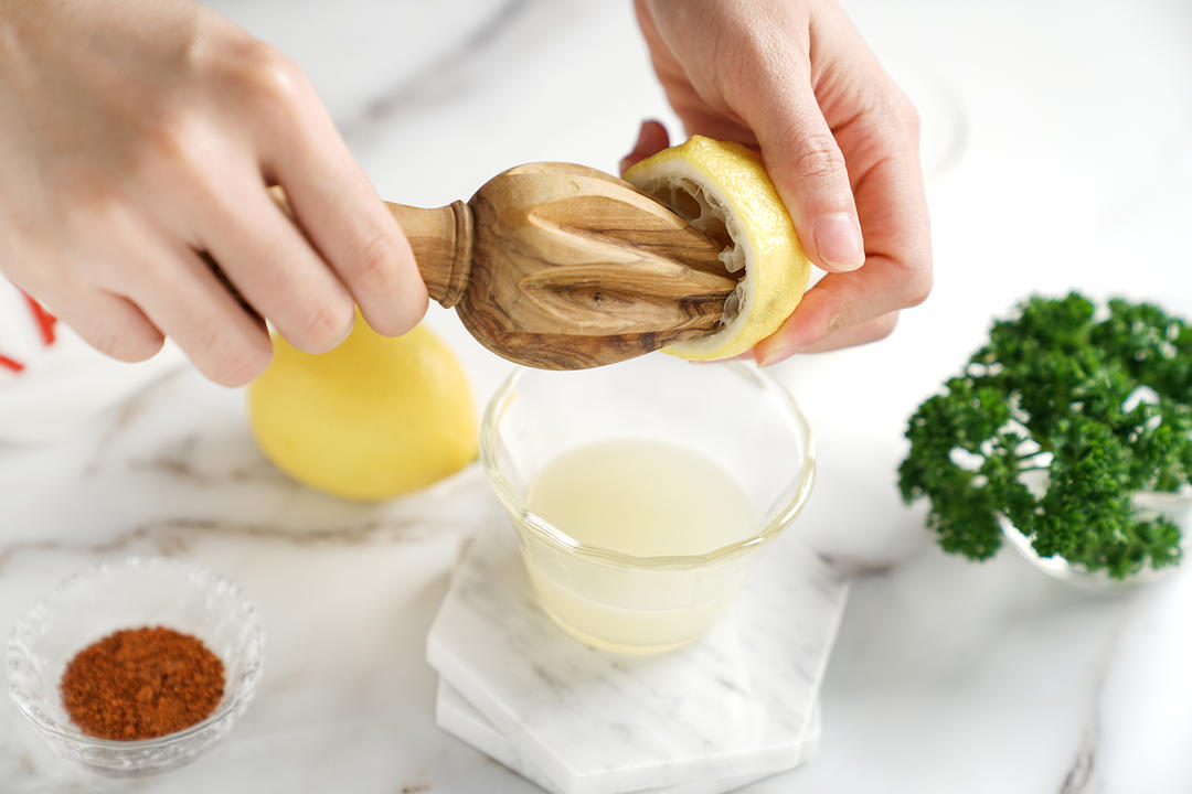柠檬对半切开挤出柠檬汁备用;