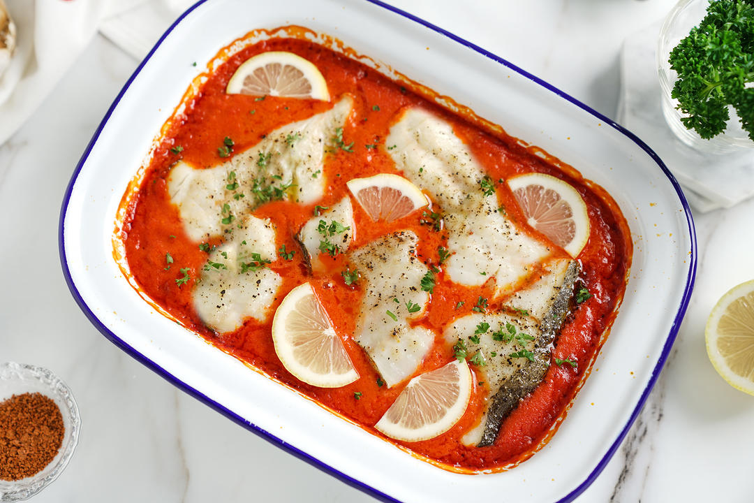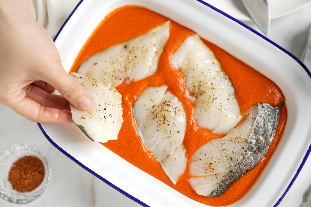 酱汁倒入焗碗中,放上鳕鱼块;
