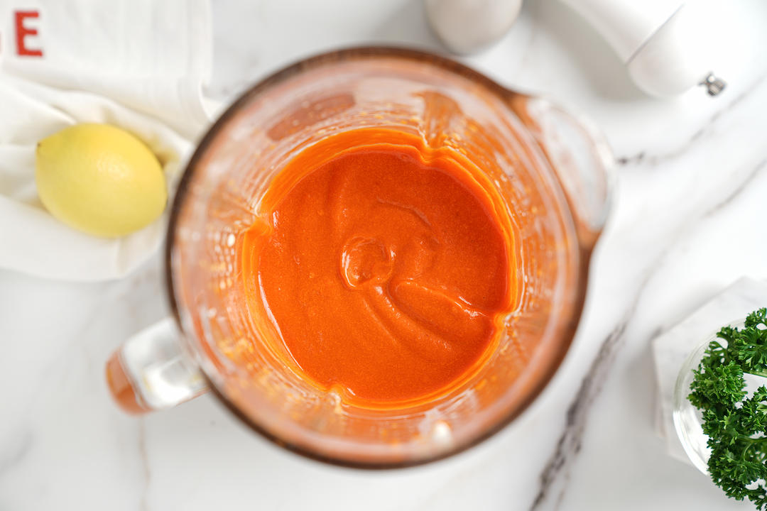 料理机中放入彩椒、蒜末、辣椒粉、奶油、柠檬汁、橄榄油、盐、欧芹碎打成酱汁;