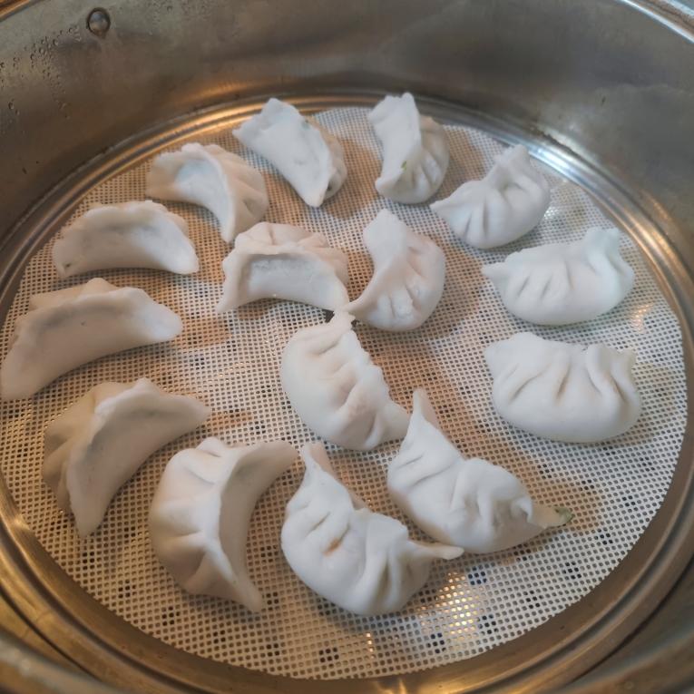 蒸锅中加入适量水,水烧开后,上锅蒸6~8分钟。蒸好的水晶饺就变成透明了。(我压的面皮还不够薄,所以透明度还不大好,技术有待提高。)