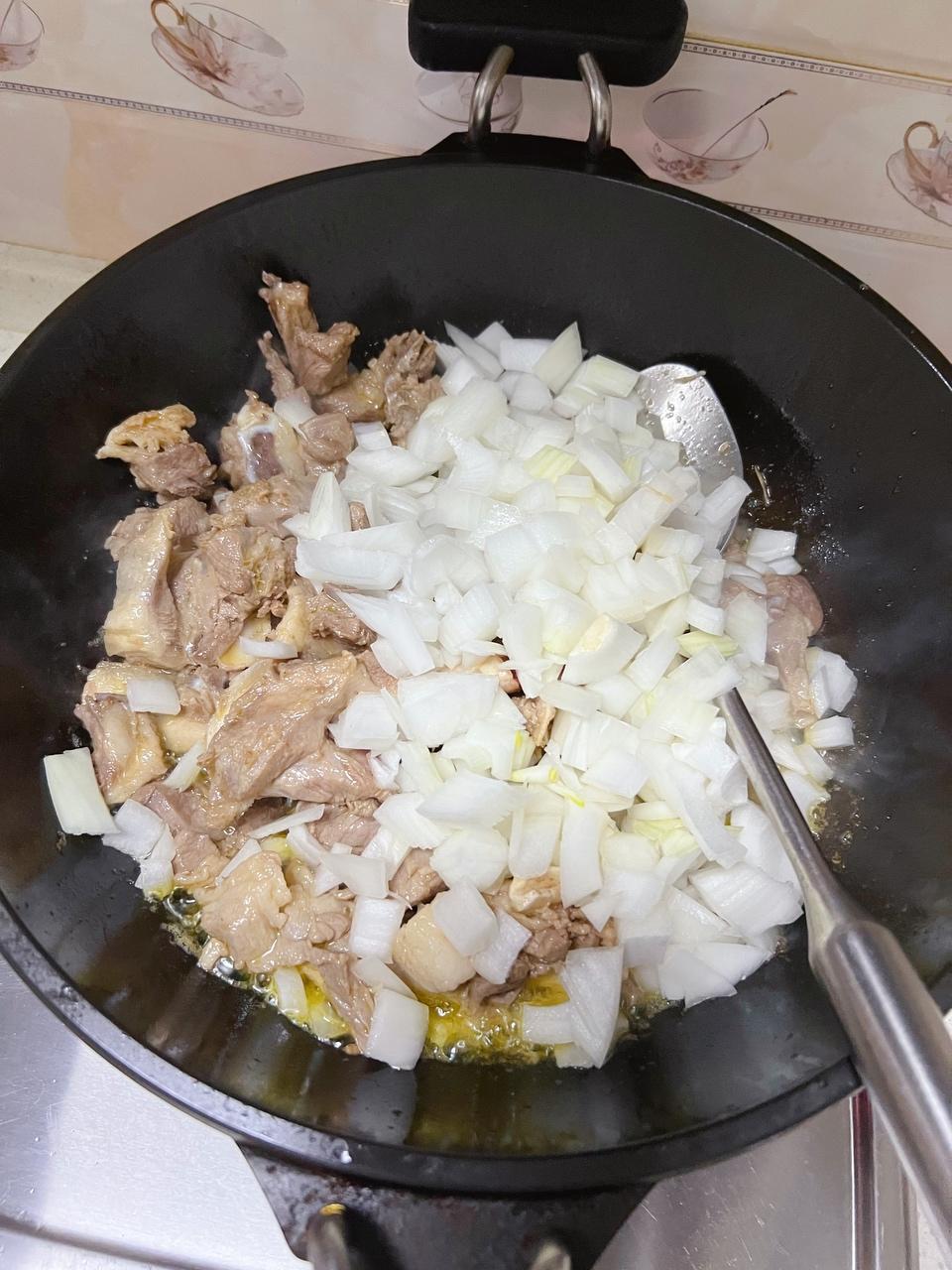 翻炒到肉没有血红色,加入洋葱继续翻炒~