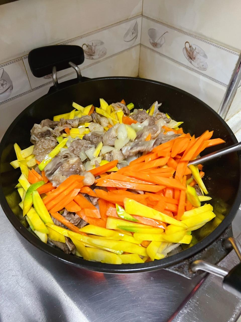 下入胡萝卜和黄萝卜翻炒一会~