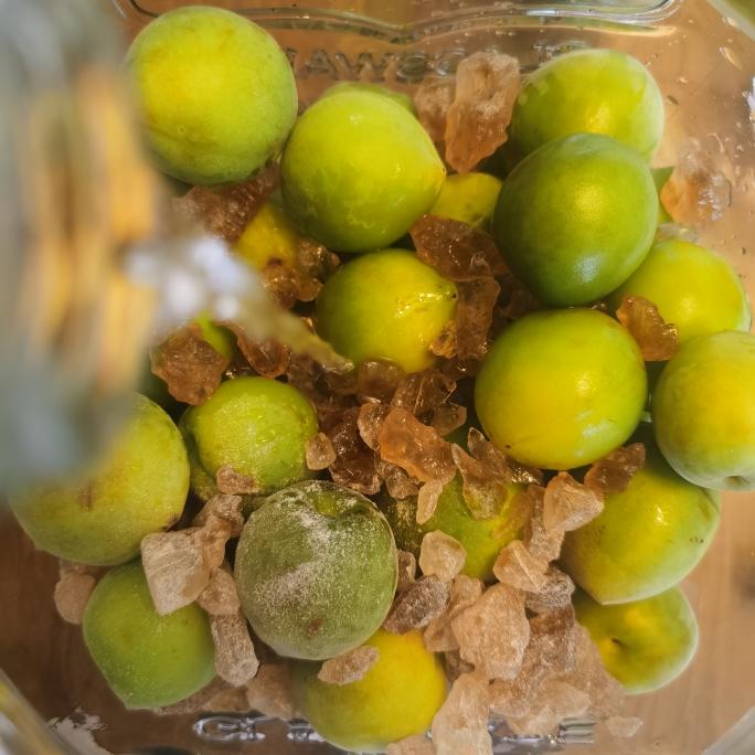 接下来找个高温消毒后无油无水的罐子,提前称量好冰糖和青梅的量。 在最下面一层铺黄冰糖,再将一层青梅放在冰糖上‼️ 以此类推,一层冰糖一层青梅~ 直到用完所有的青梅和糖哦~