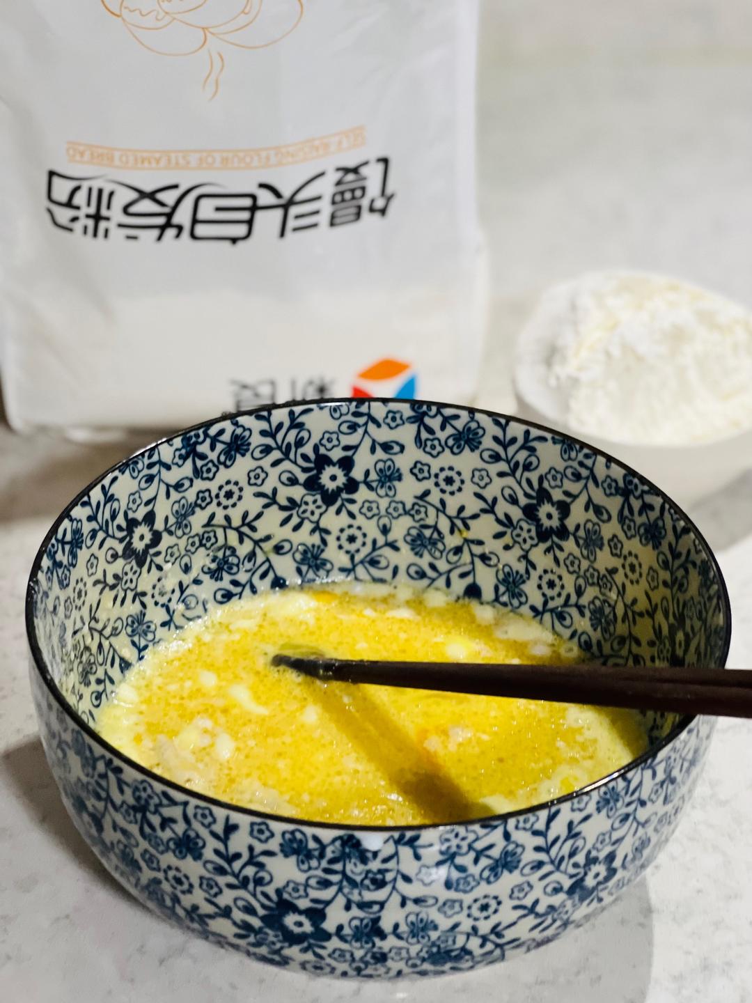 2个鸡蛋,30克色拉油,50克白糖,半袋牛奶搅拌均匀。