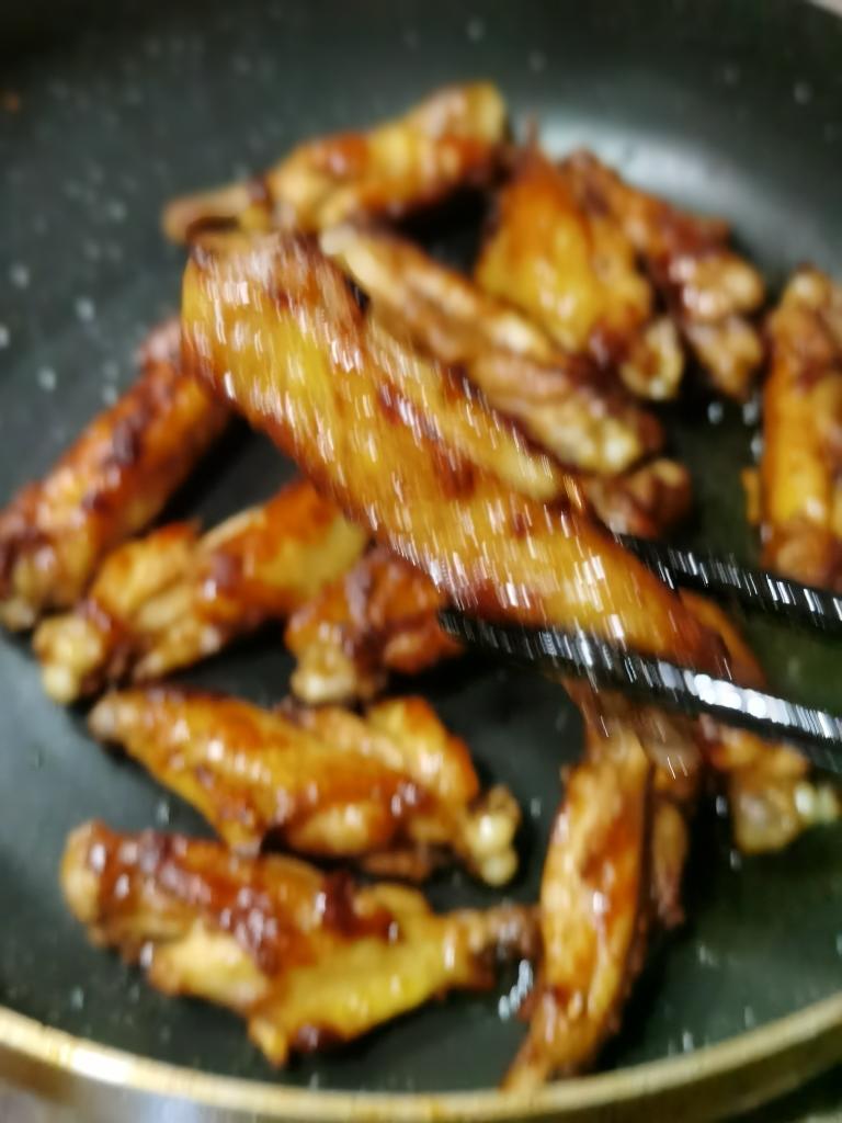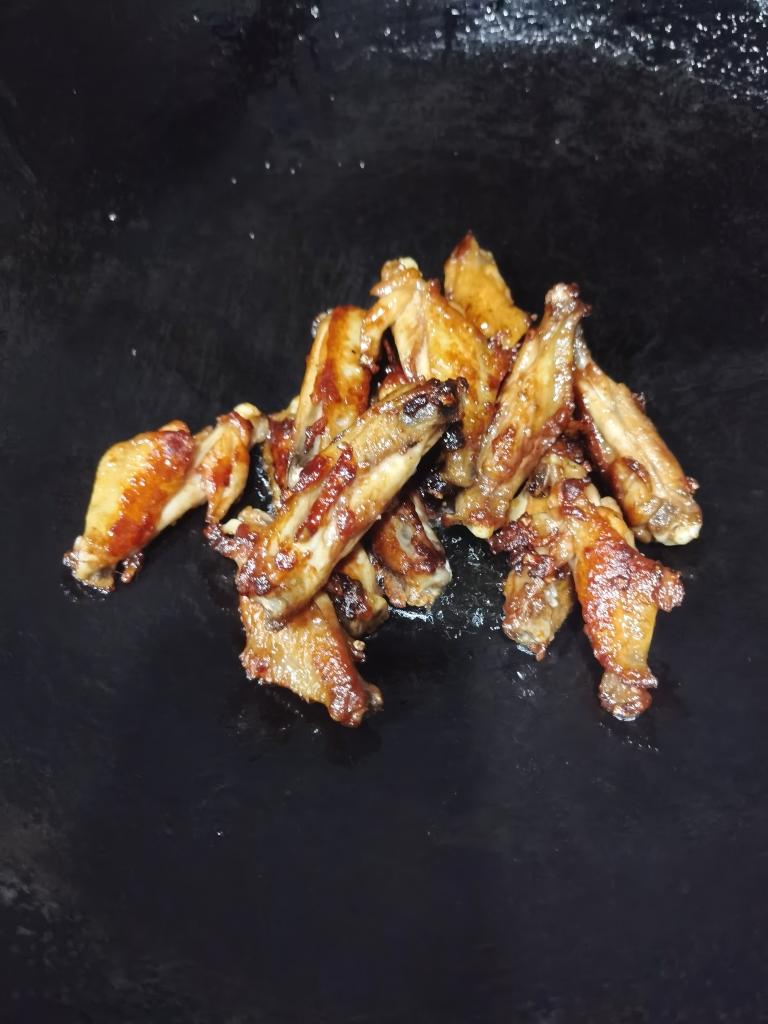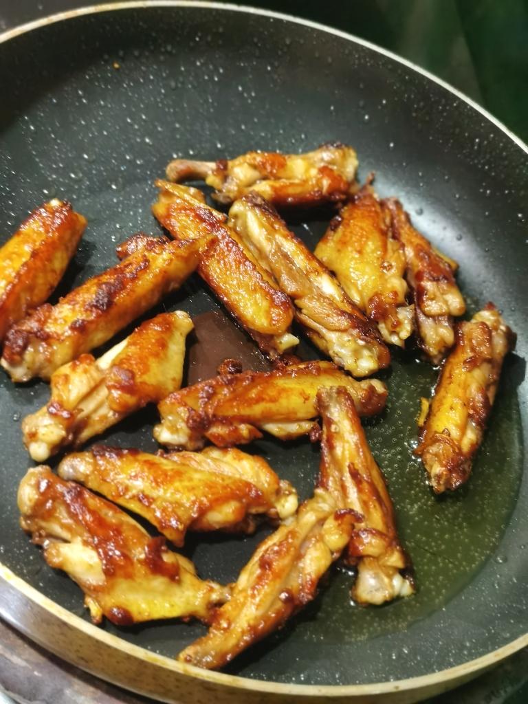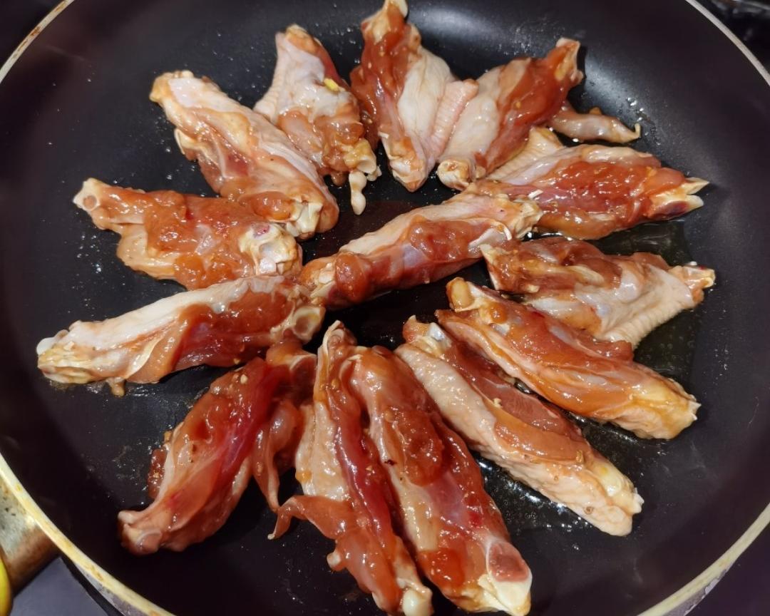 换一个锅,倒少许食用油润润锅,把鸡翅夹过去(煎鸡翅的油就不要了)→_→