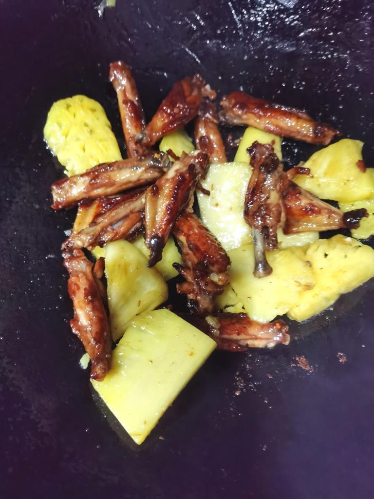 快速翻炒一下,把菠萝也倒下去,这时你如果榨了菠萝汁的话也倒下去,我没榨所以没得倒😜加入一勺白砂糖,倒入淀粉水翻炒均匀→_→