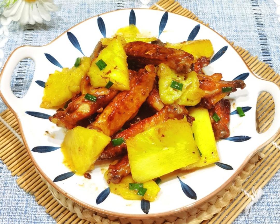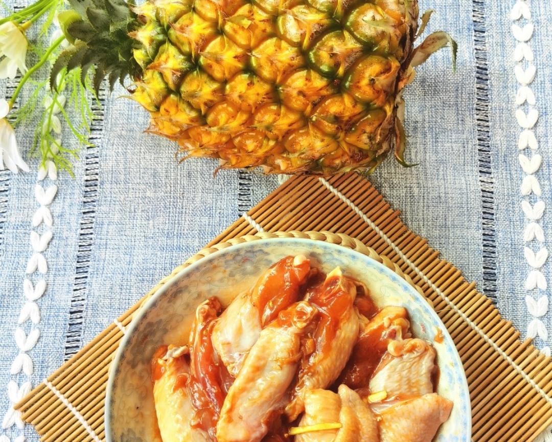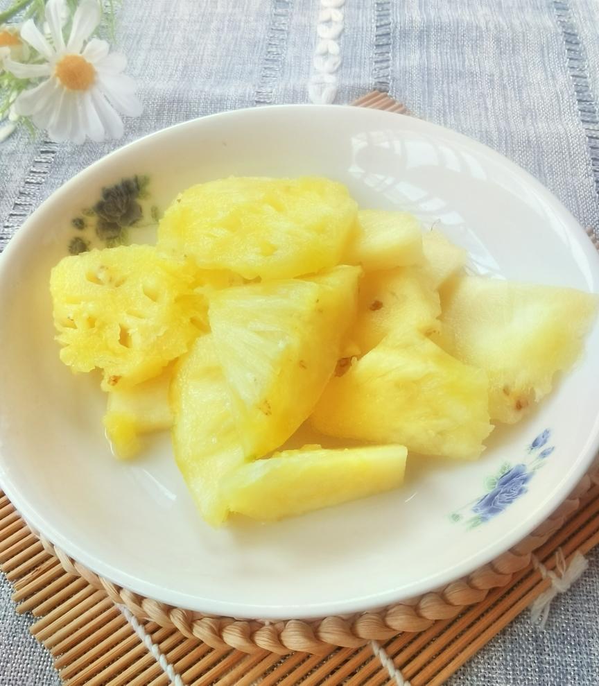腌鸡翅的时间来准备菠萝,菠萝去皮取肉(这步可以让店家帮忙处理好)放入准备好的盐水里浸泡5分钟捞出→_→备用→_→
