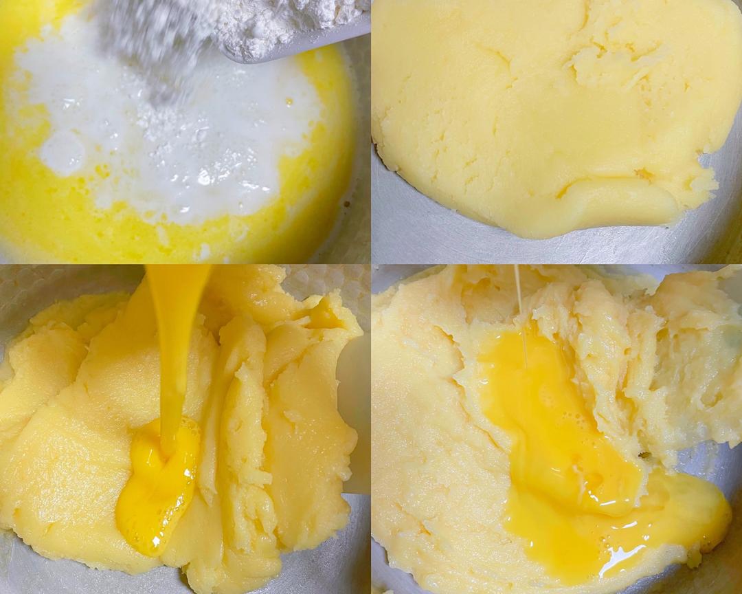 将黄油、牛奶、食盐、糖放在锅中加热至微沸腾加入低筋面粉关火,搅匀至无干粉后晾至温热。