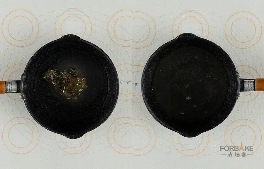 将水、细砂糖和提前泡发好的吉利丁加热,充分搅拌均匀。