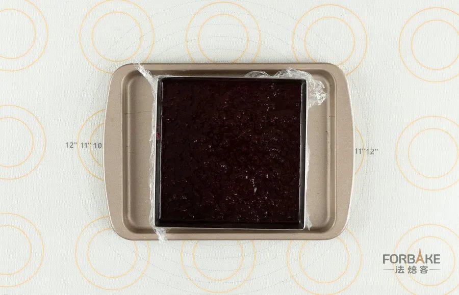 慕斯圈底部包保鲜膜,将做好的果冻液倒入,放入冰箱冷冻。(配方量可以做2片)