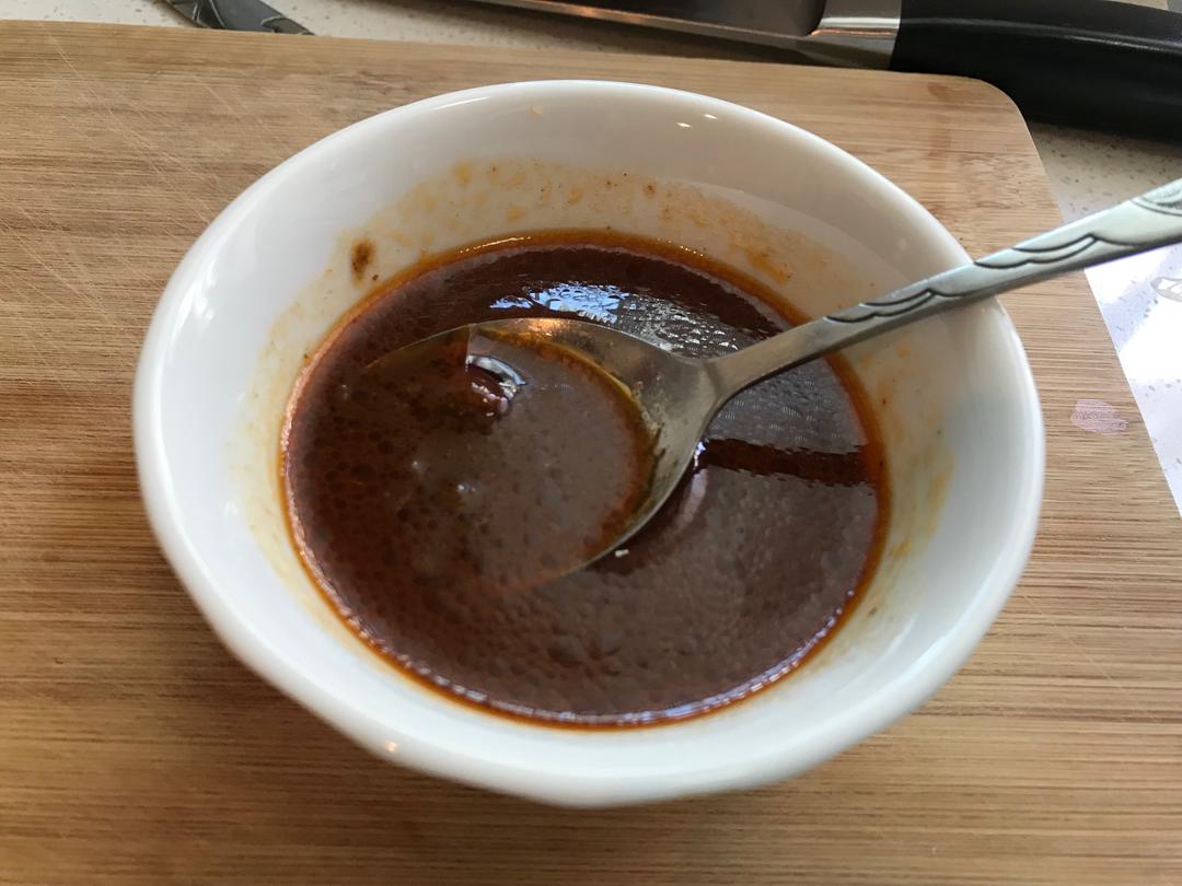 沙茶酱一大勺、生抽一勺、白糖半勺、一勺清水,拌匀