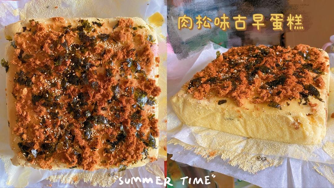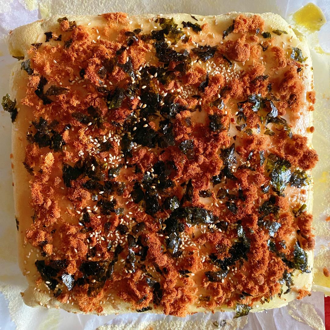 1、用水浴法,蛋糕模具下面我放了一个三能的金盘,放进清水。 2、烤箱预热,上管150度、下管170度,烤50分钟。具体温度时间要看自己的烤箱而定哦~ 3、开始上色后,拿蛋糕出来,刷上沙拉酱,撒肉松紫菜芝麻,再烤10分钟。