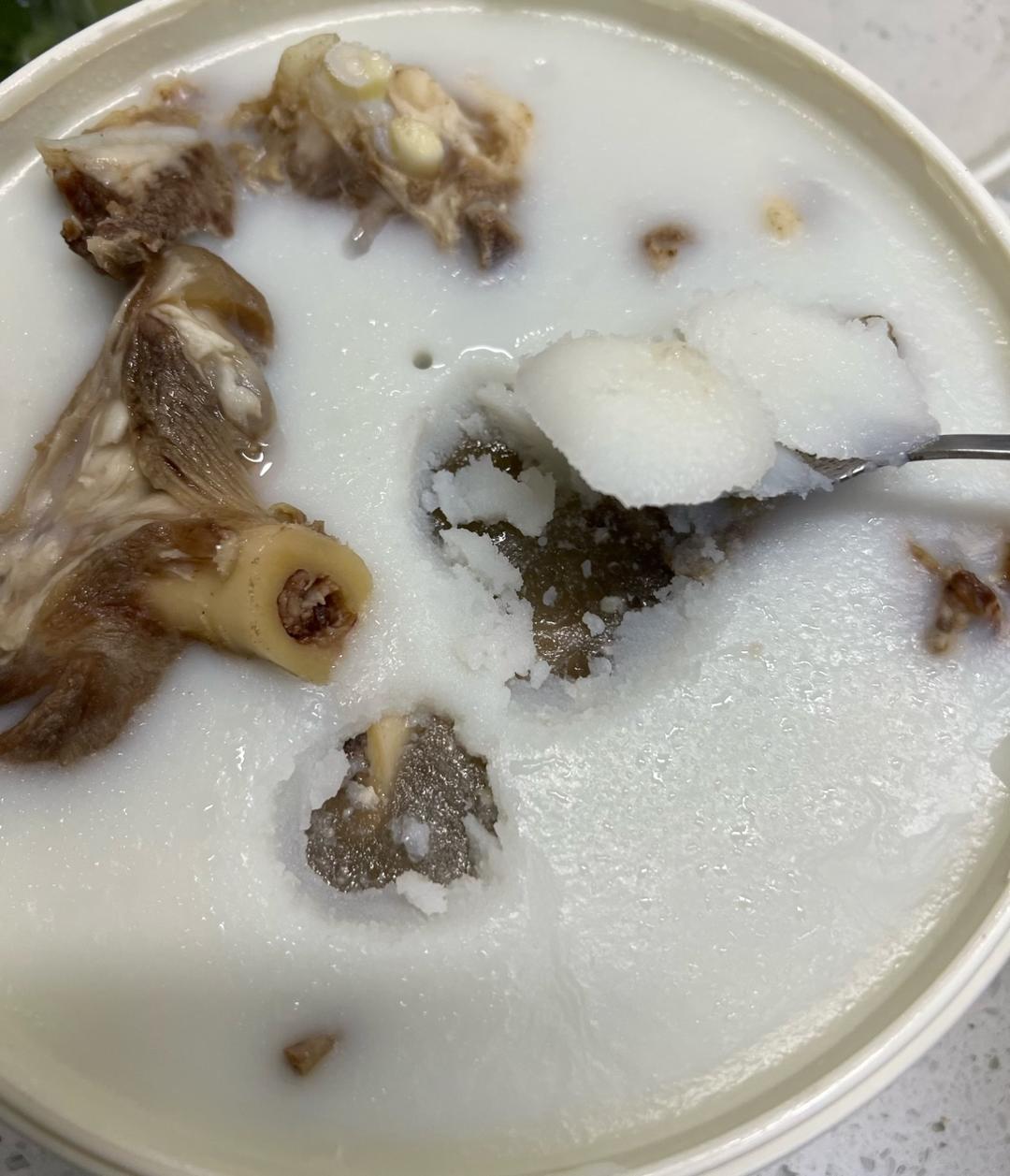 羊肉汤经过一宿的冷藏,表面一层厚厚的羊油,不喜欢的用勺把油舀出去