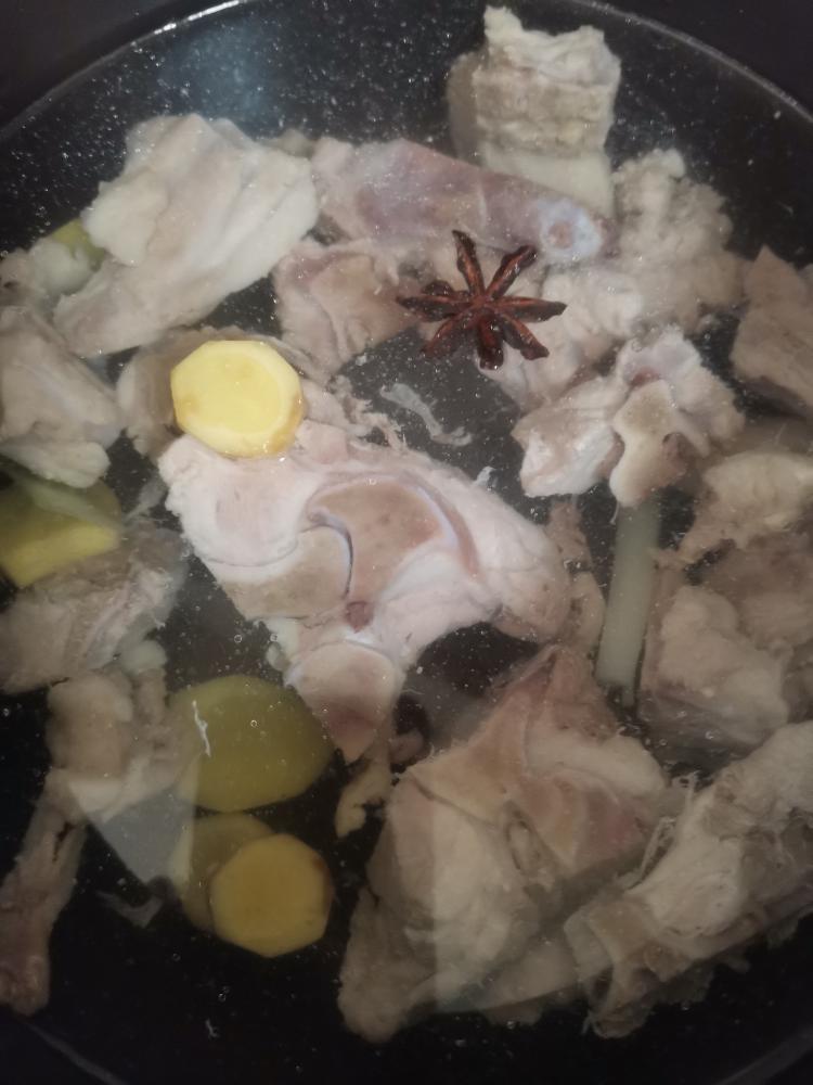猪脊骨凉水下锅放入5克糯米酒,葱姜开锅撇去血沫,温水洗净