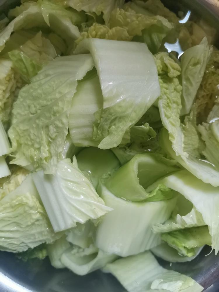 龙牙贵族白菜洗净,这个白菜不大,一颗正合适,切块备用