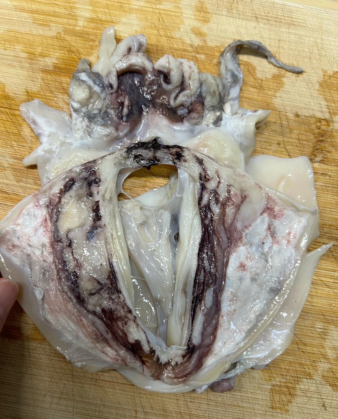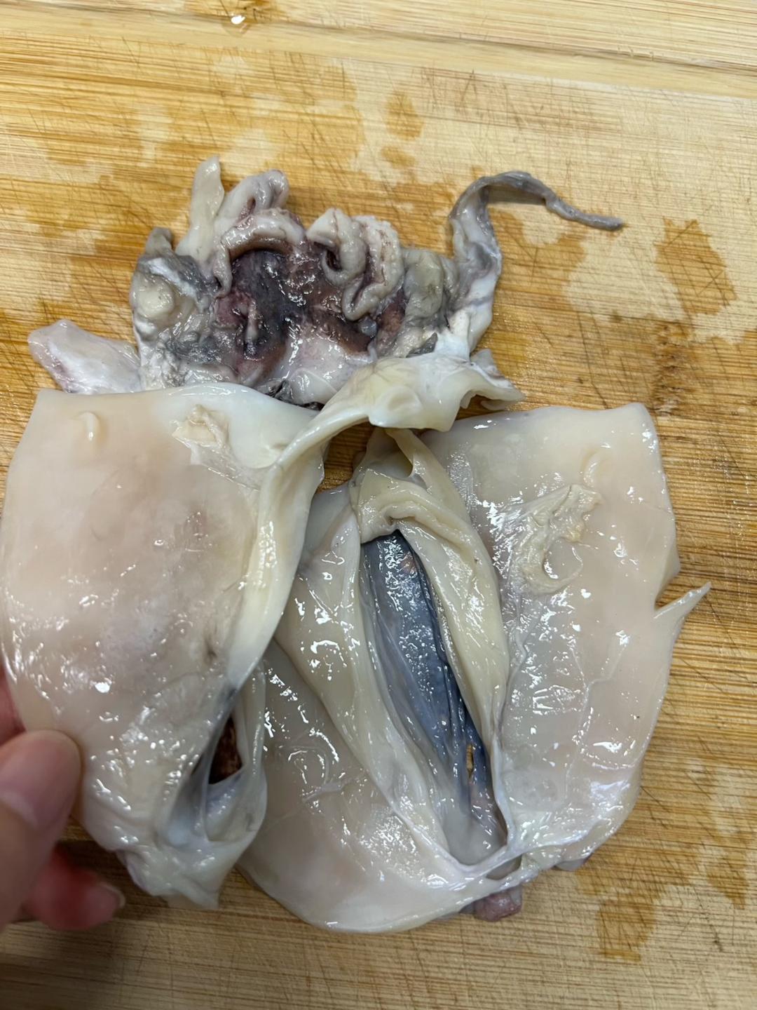 泡发好的墨鱼干,我泡发了半天的时间,表面有一层黑色膜