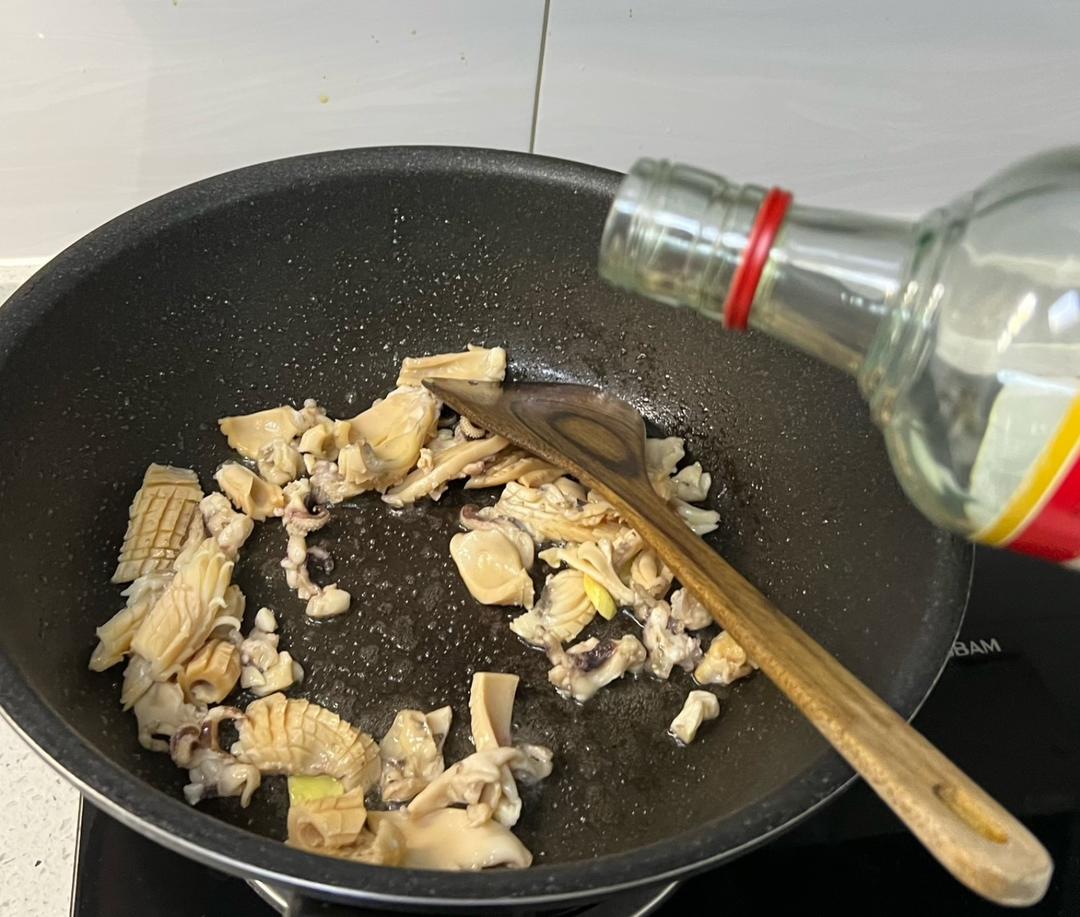 墨鱼有个白色的骨头,是一味动物性中药,煲汤时可以放进去一起煮,有收敛止血,固精,止痛等功效。今天做的是炒的,所以不用这个白色的骨头