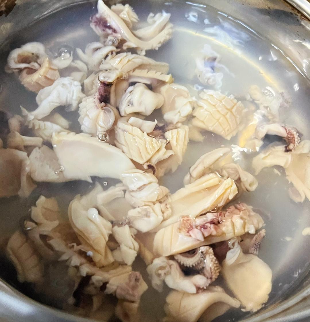 把墨鱼上的黑皮撕掉,可以打花刀,也可以直接切小条。烧一锅开水,把墨鱼干下锅焯一下,去腥味和咸味