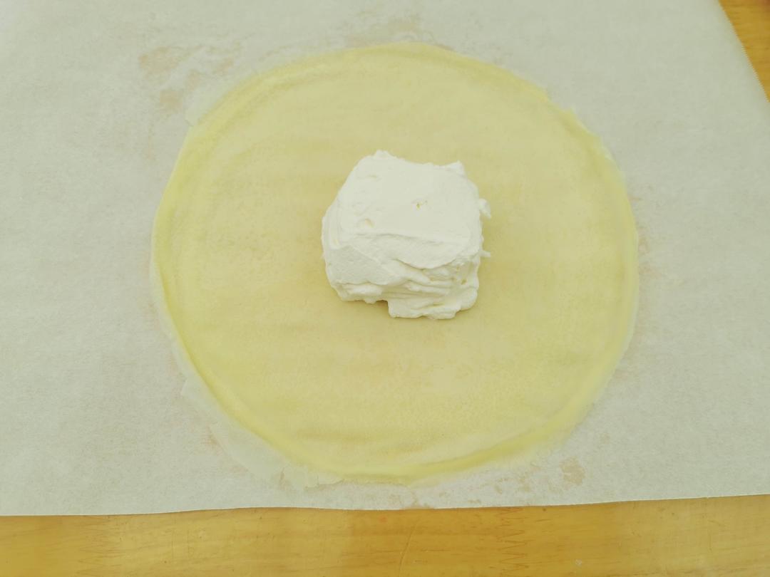 取一张面皮,放上一勺淡奶油,再放入芒果