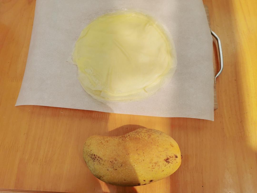 将饼皮用油纸或者保鲜膜封起来放凉,芒果切块备用