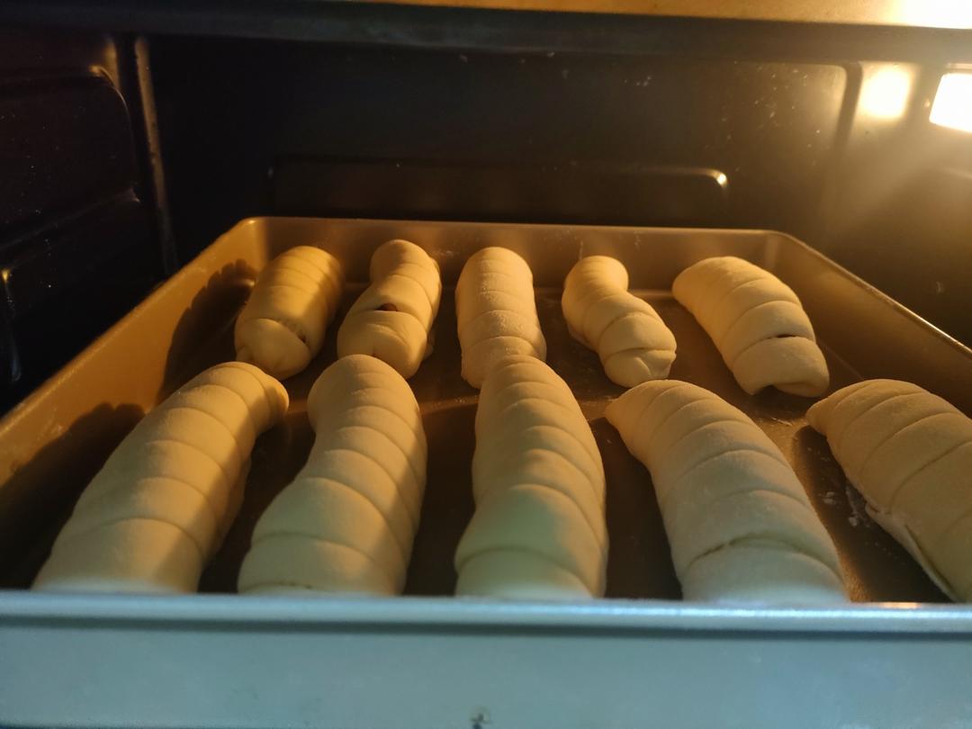 发酵双倍大后,拿出均匀分成22份,擀成圆饼,照图将肠摆平,挤上沙拉酱,切成半圆条状卷起来。