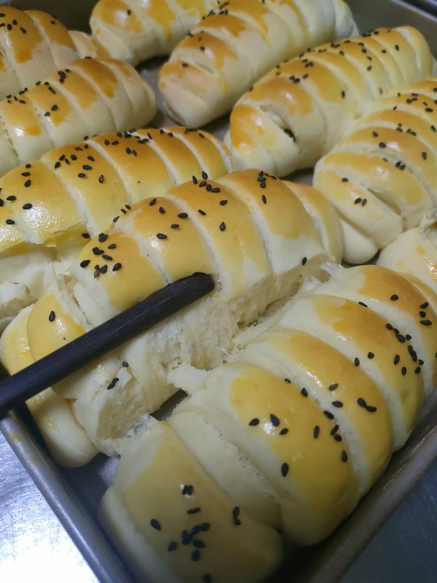 (秘方🤭这样上色轻)打一个蛋黄,加少许牛奶调匀,刷表面撒上芝麻。入烤箱170℃烤15分钟。根据自家烤箱脾气观察上色诱人了即可,时间可调。