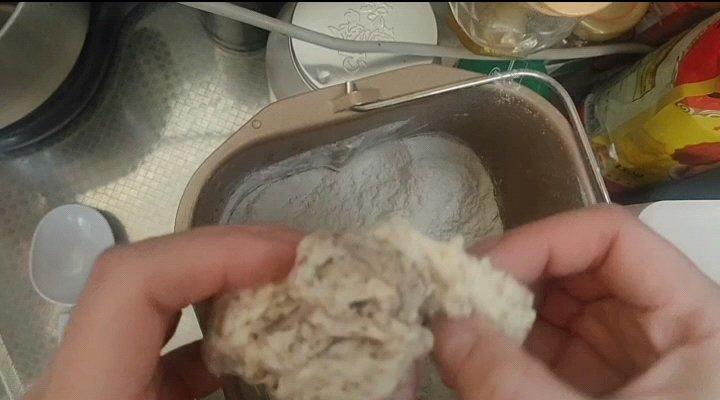 将面团总重量的十分之一分割出来,然后再均分2份。 先取其中一份撕成小块放入揉面缸。