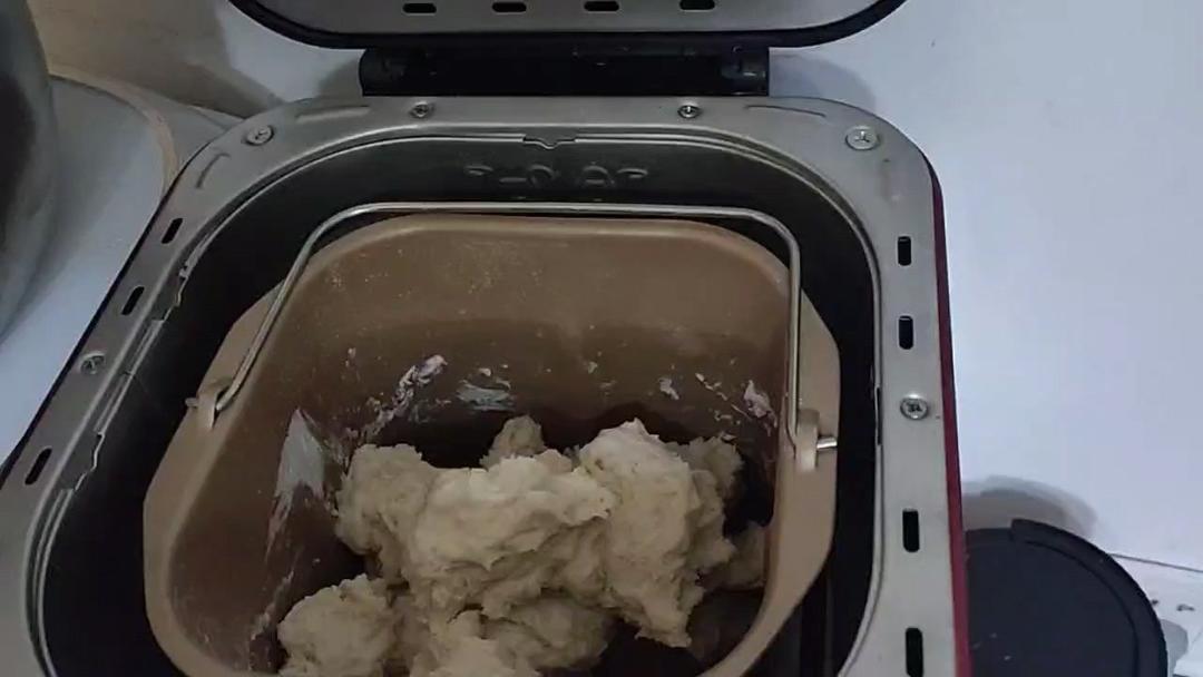启动发酵功能,发酵一小时。一小时后,启动揉面功能1分钟后排气,取出面团。