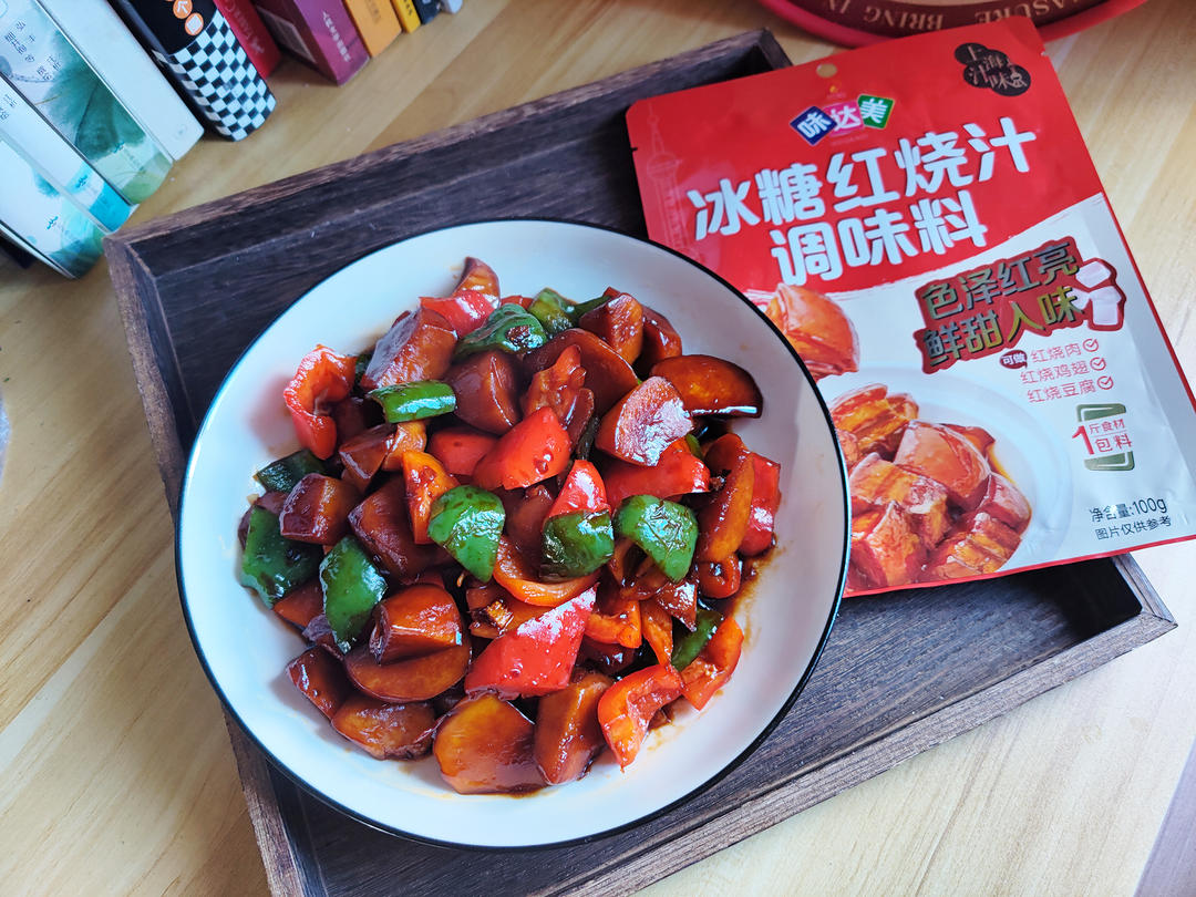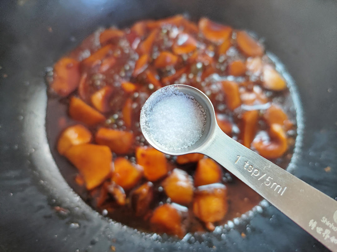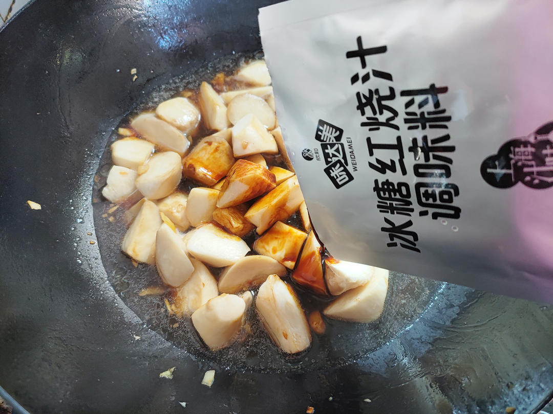 倒入一碗水,再倒入冰糖红烧汁调味料,拌匀,盖上大火煮开转小火焖煮五分钟。