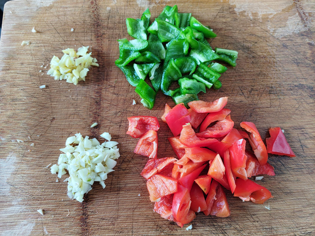 姜、蒜和辣椒洗好切好。