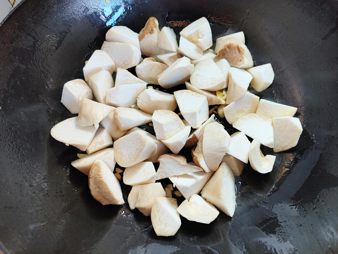倒入杏鲍菇翻炒至微焦。