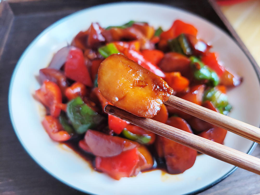 倒入青红泡椒再翻炒一两分钟就可以出锅了。