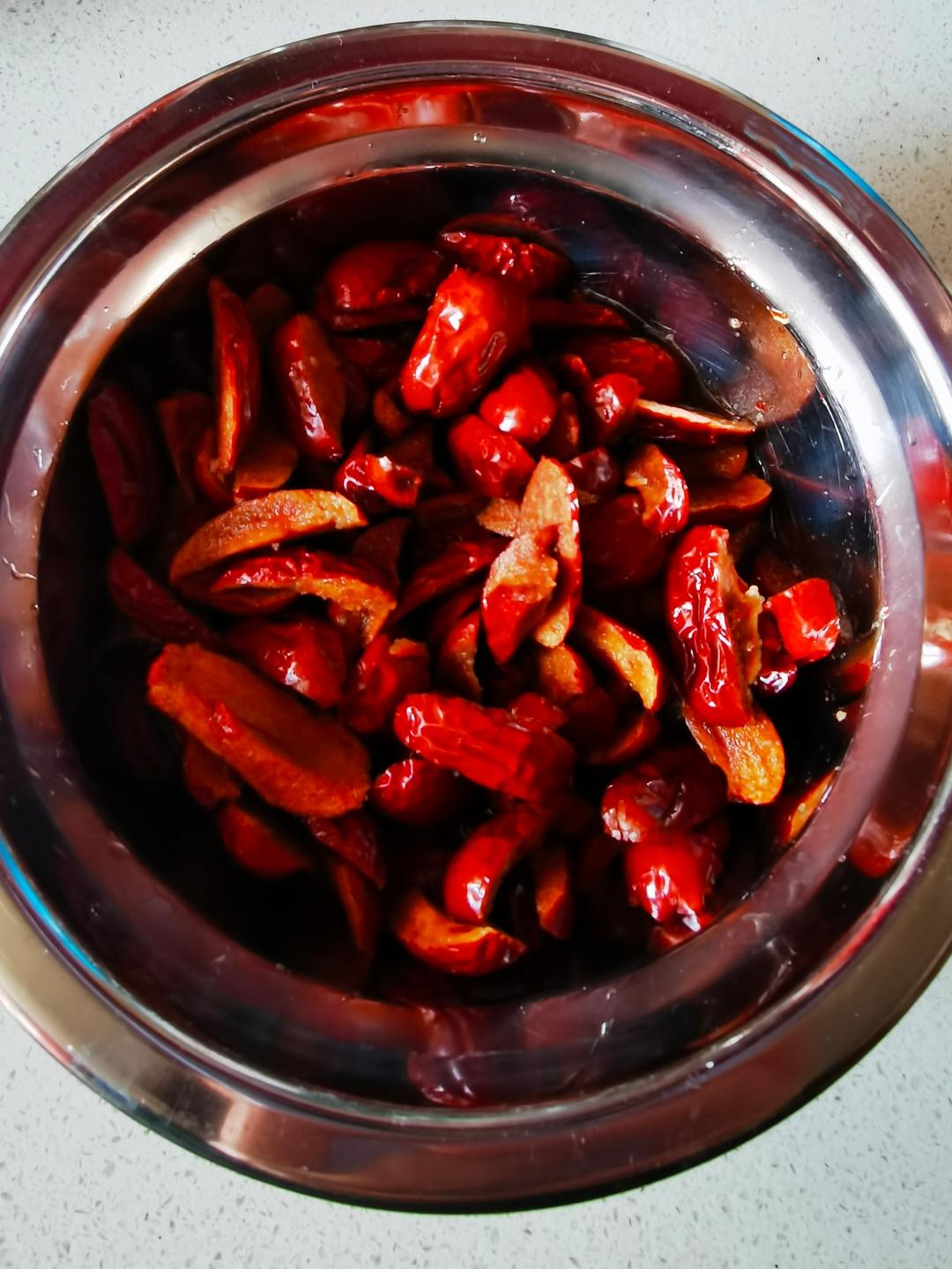 干红枣用剪刀去核倒入温水,等红枣吸收水分变软