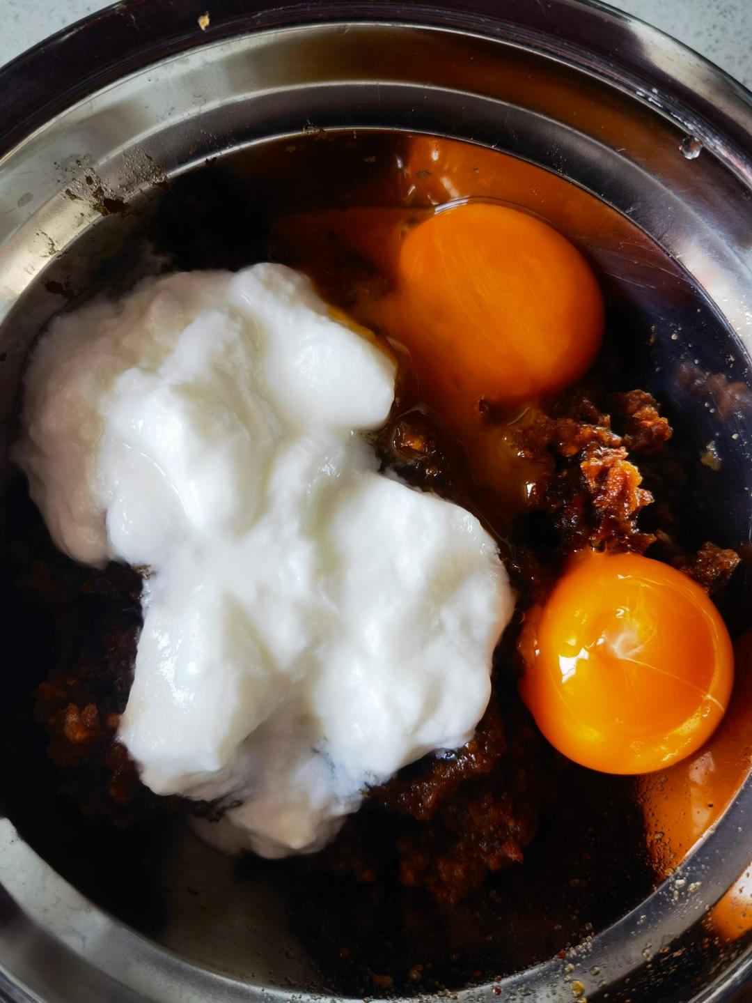 加入鸡蛋,酸奶(我用的是自制的无糖老酸奶),糖盐搅拌均匀再筛入面粉和泡打粉搅拌成糊状