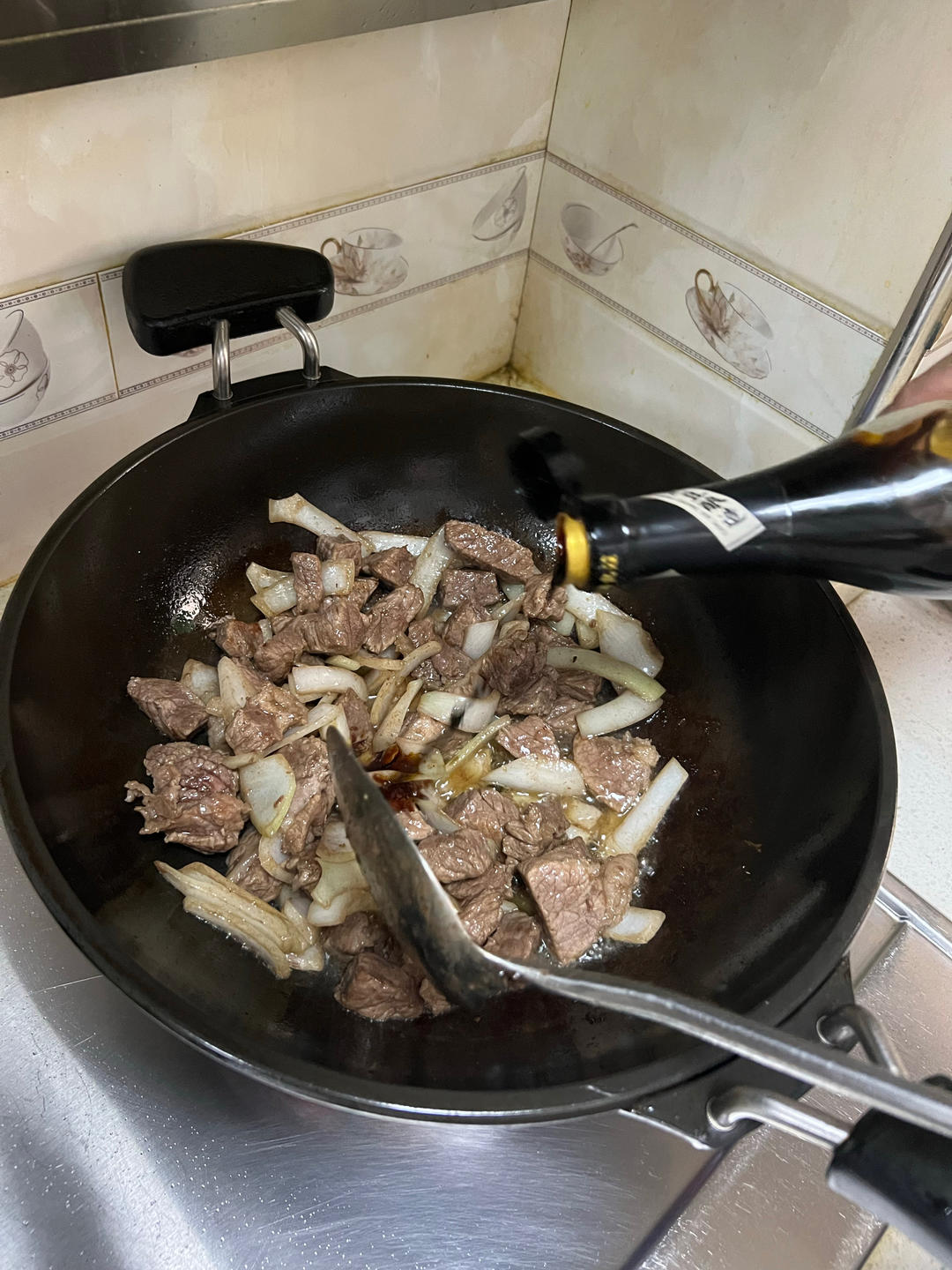 牛肉切块,热锅冷油放入牛肉翻炒,炒至出水后(就是油开始滋啦滋啦响的时候,水就差不多出完了),放入洋葱块翻炒。