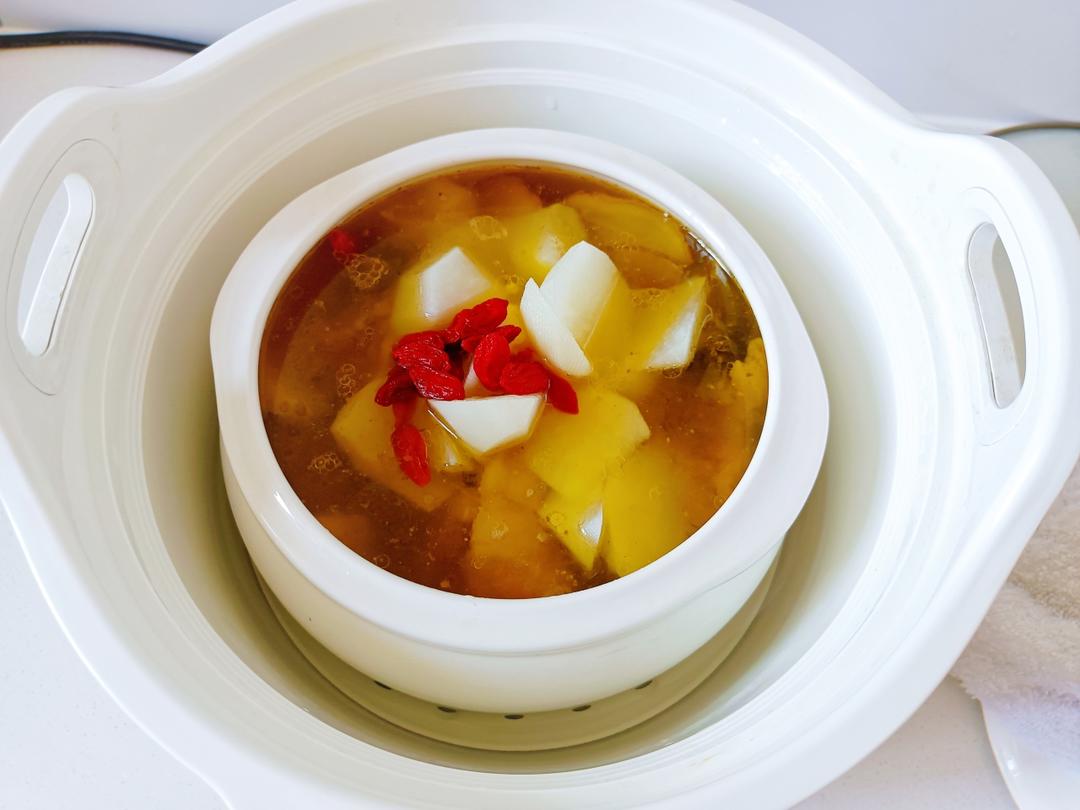 两小时后,放入白萝卜和枸杞子,继续炖煮,待萝卜软烂即可。 根据食材和汤的多少加入适量的盐调味。