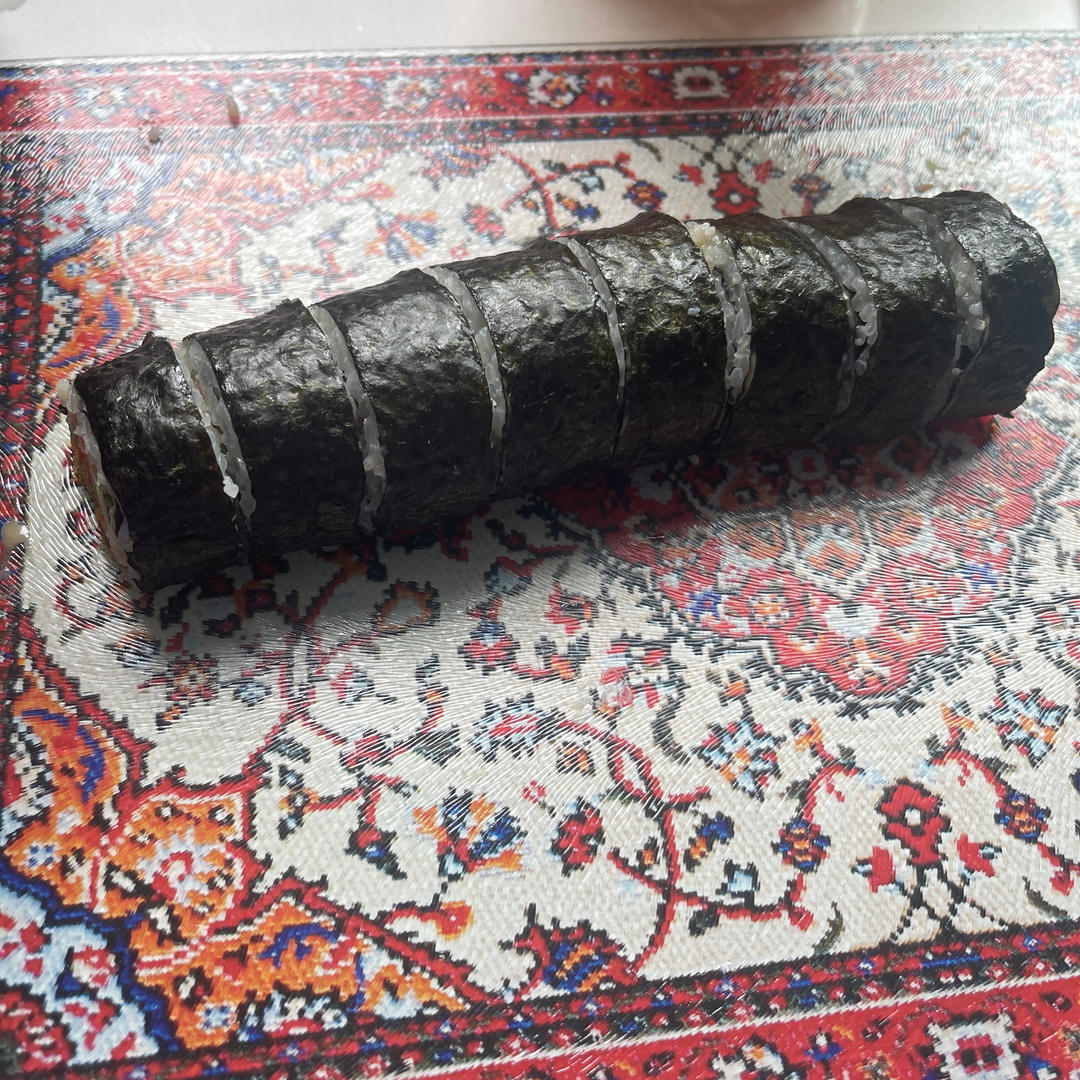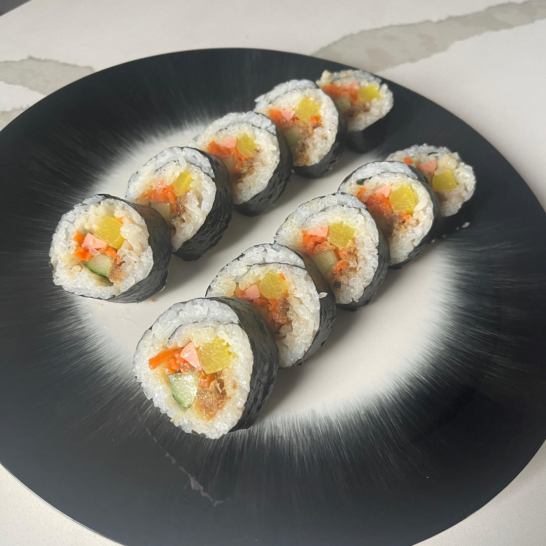 【5】海苔下方3指距离处,横着打上一条沙拉酱,左右两边预留2指距离不要挤酱 【6】再铺上25g的肉松,肉松一定要左右从头铺到尾 【7】再叠加放入胡萝卜丝,两头也一定要铺 【8】再依次放入1条黄瓜、1条火腿、1条寿司萝卜 【9】八个手指并排向下按住食材,大拇指提起卷帘,提到最高点,往下压,双手同时定型,第一下就捏成方形 【10】一个手抽出来扶住卷帘,另一个手也抽出来,同时用力中间两边初步定型,两手往后退半圈定型 【11】一个手抽出卷帘,一个手向前推进半圈,中间两边定型,再重复上一个动作 【12】两边的食材收一下,往里怼怼,收一下,这样后面切的时候就没有边角料了 【13】最后一次用卷帘包裹住整个寿司卷定型