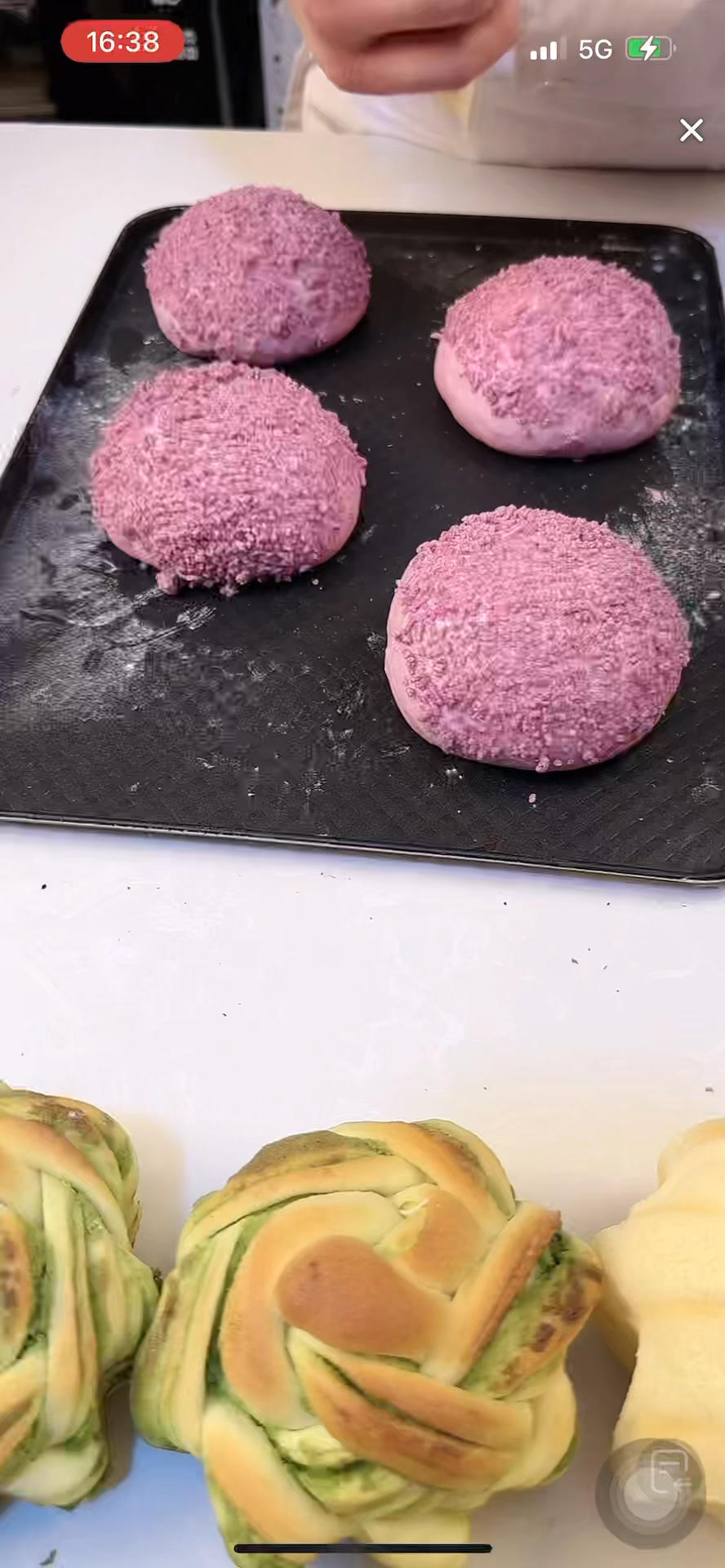 表面沾上紫酥粒,摆入烤盘,紫酥粒具体做法见魔法棒的课程,点这里👉https://www.xiachufang.com/recipe/107202561/,老师的也是上次做的,用不完可以冷冻保存,至少两三个月没问题。