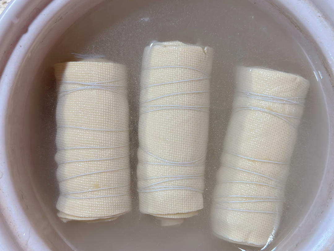 卷紧一些 然后用棉线扎好 传统的素鸡是包棉布的 那样形状好看也更紧实,我没有棉布 就用棉线了。