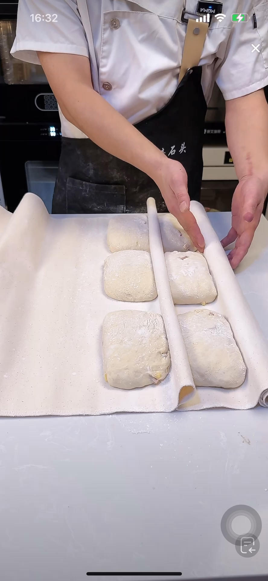 发酵布撒干粉,分切好的恰巴塔,转移到发酵布上 (发酵布千万不能洗,可以晒)