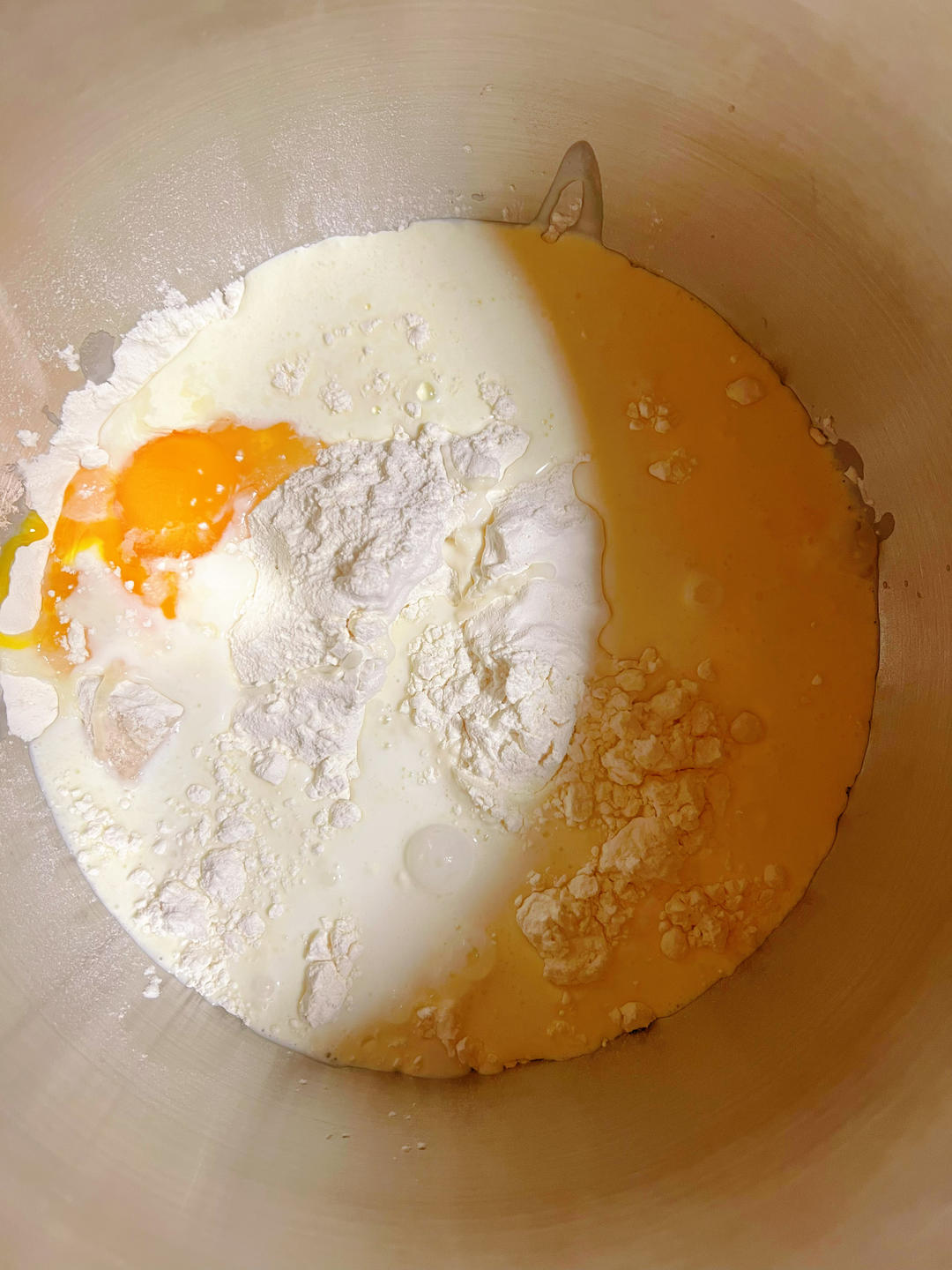除黄油和盐以外的材料全放入厨师机桶里,2档3分钟,面粉和液体成团后转5档7分钟。