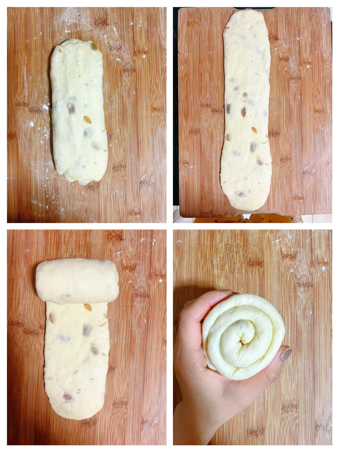 依次取出松弛好的面团,排气,擀开、翻面,由上往下卷起。
