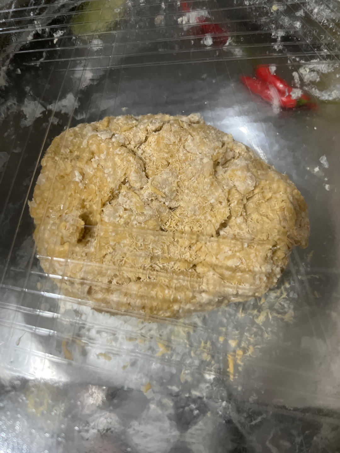 把冷热两边的面粉和成光滑的面团,和面盆口封上保鲜膜醒面半个小时。