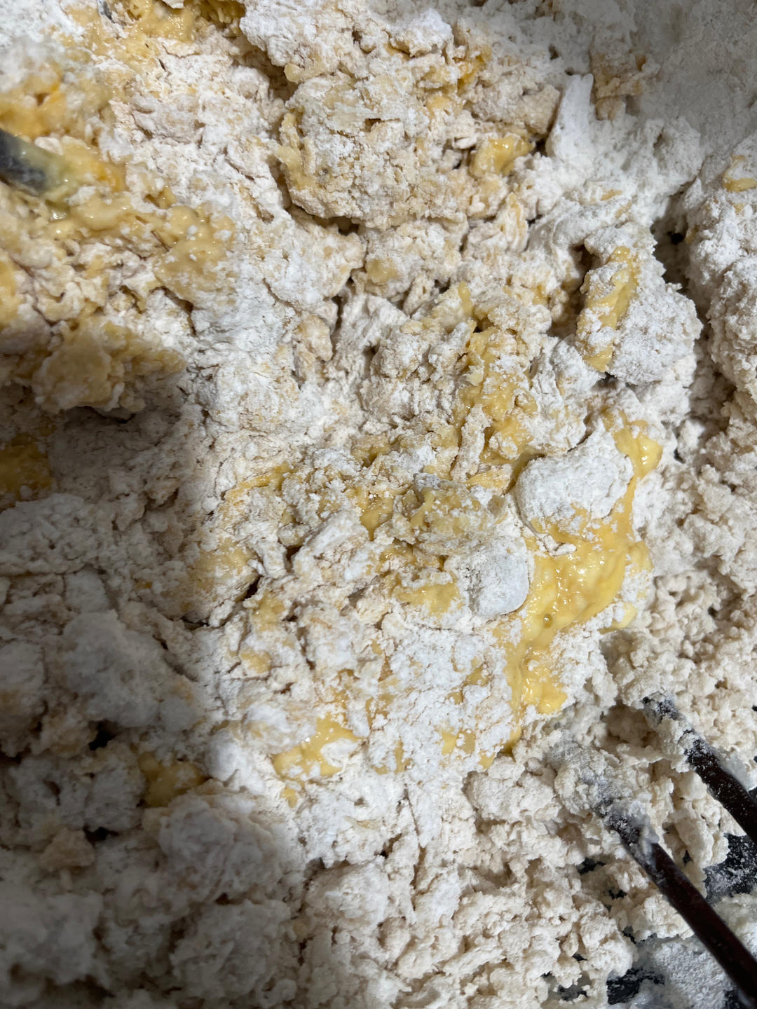 盆内加入面粉和3克食盐搅拌均匀,一半加入沸水用筷子快速搅拌成絮状,一半加入三只鸡蛋液和凉水搅拌均匀的水💦,同样用筷子快速的搅拌成絮状。加入鸡蛋和食盐,只是为了增加全麦粉的劲道。