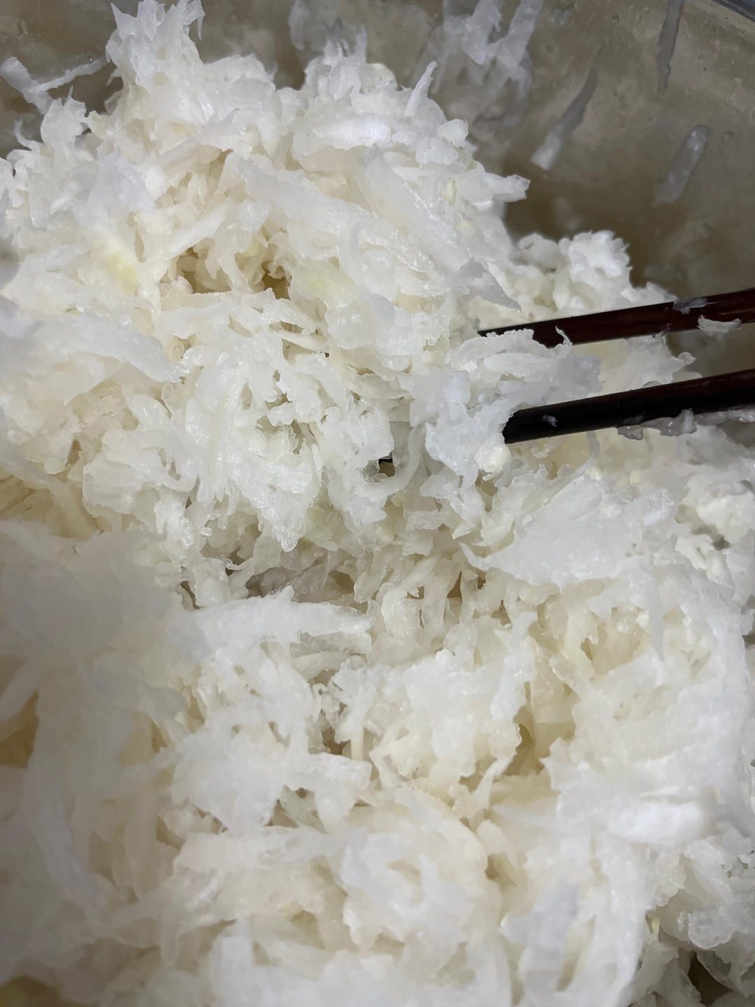 拌馅料。白萝卜洗净、去皮、刨丝,挤去水份得白萝卜丝1470克。然后加入20克食盐丝,杀下水,也让萝卜丝入味。