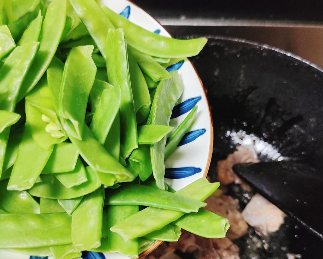 排骨炒至微黄后,倒入荷兰豆