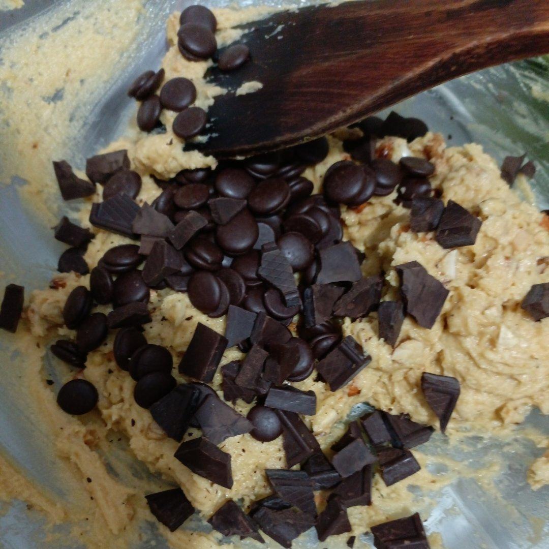 加入黑巧克力豆,市售黑巧克力,混合均匀。(我用的是百分百的豆,百分之八十五的市售),因为家中就这种,大家都用百分之七十五的就可以了。