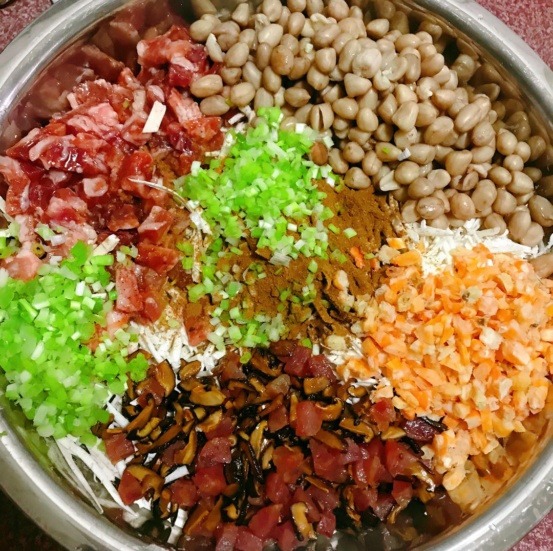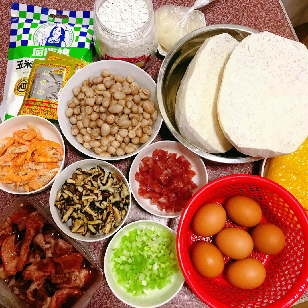 芋头用切丝器擦丝后,加入花生、虾米、香菇、葱白、蜡肠、五香粉。